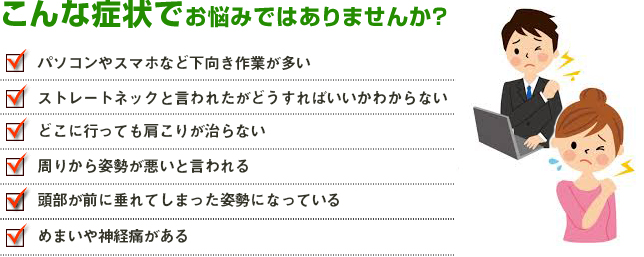 姿勢が悪く、頭部が前に出てしまっている状態が長く続くと首の筋肉に常に負担がかかり慢性的な肩こり、頭痛、神経、めまい、うつ病など様々な症状を引き起こしてしまいます。